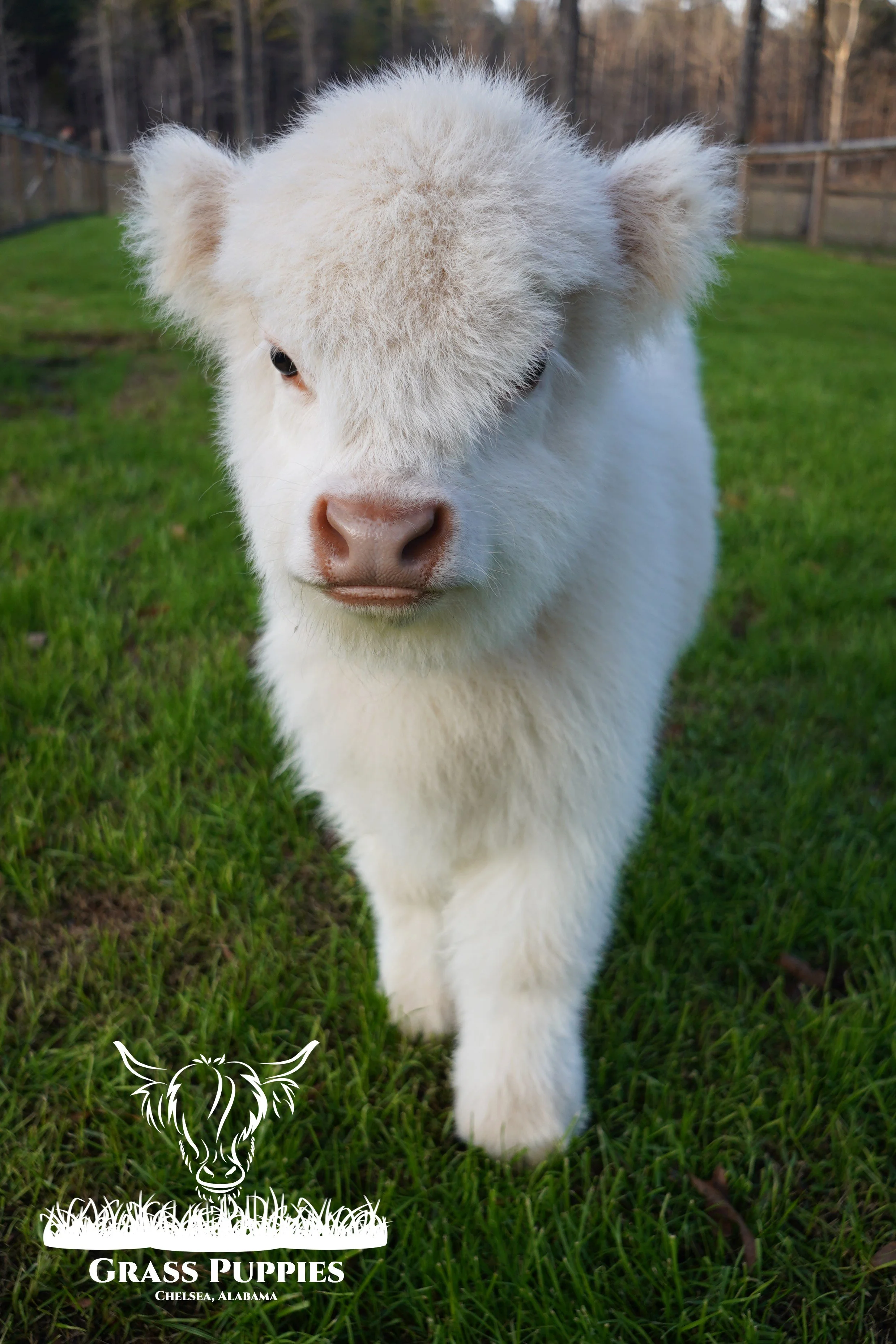 Opal is a micro/mini white high % Highland heifer born November 11th, 2025. She is chondro positive and expected to mature around 36”-38”. She was born measuring 20” and weighing 36 lbs. Her parents are MarshMello (37” C+ High % Highland) and Johan (43” Highland). She does have very minor crop ear (tictac size missing from the edge of her ear). She is a bottle baby that will be used in many of our petting zoo events, so she will come very friendly. She is expected to wean around March 2026!